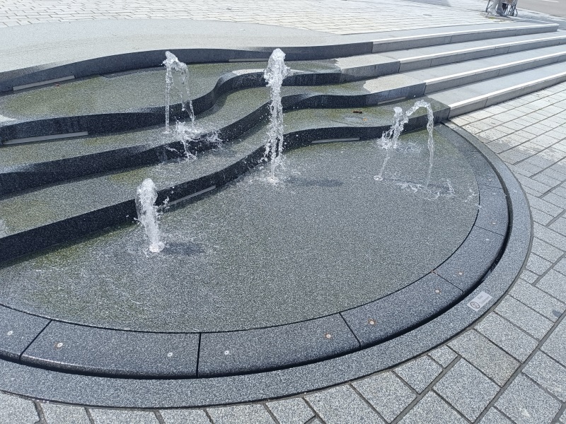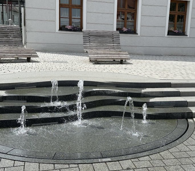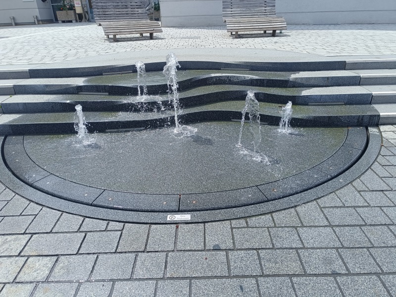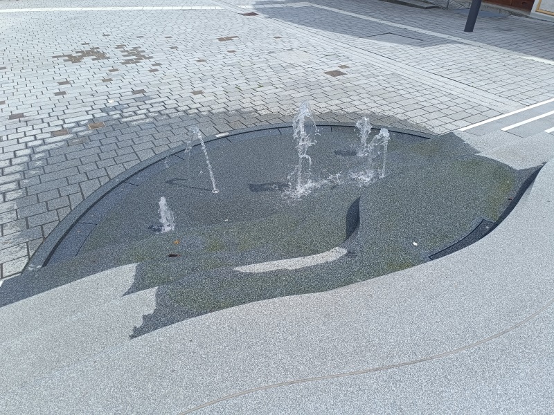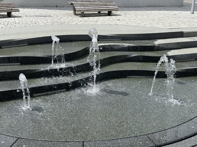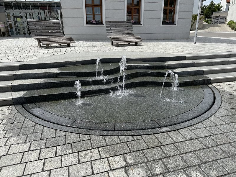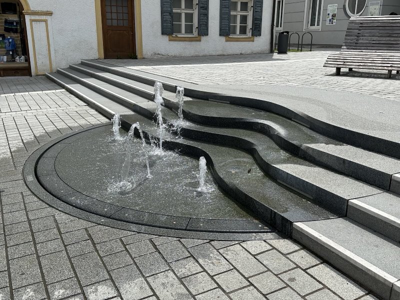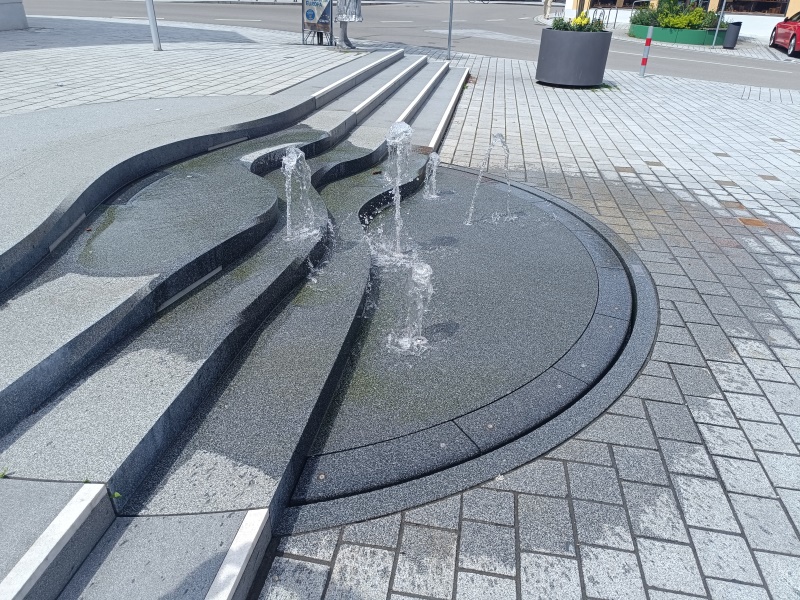 Brunnen mit fünf Bodenfontänen fügt sich sehr schön