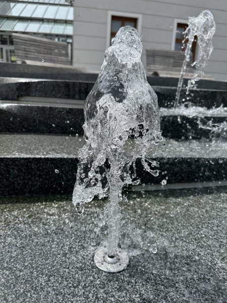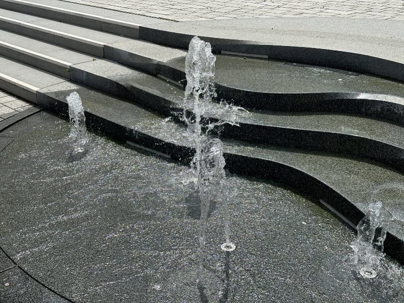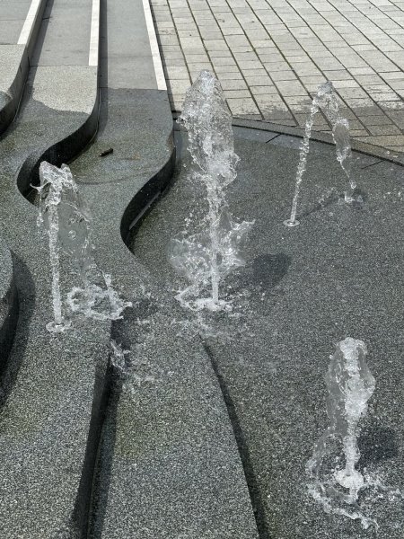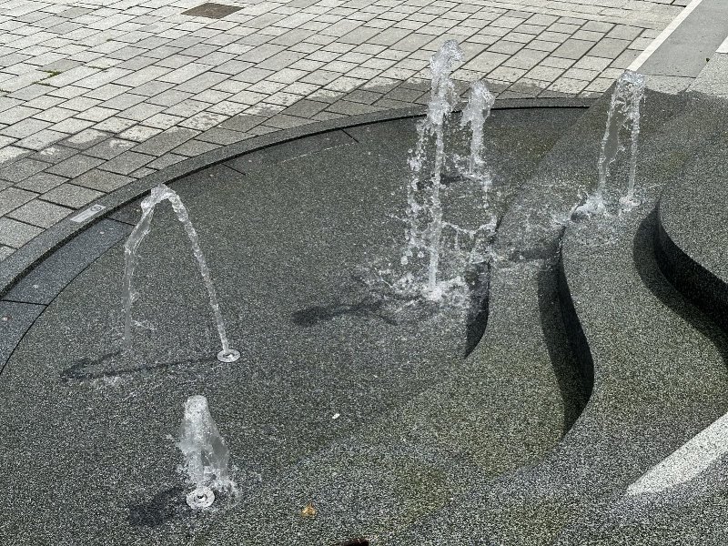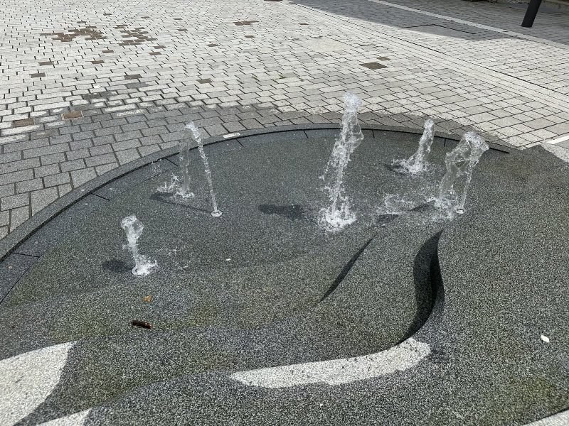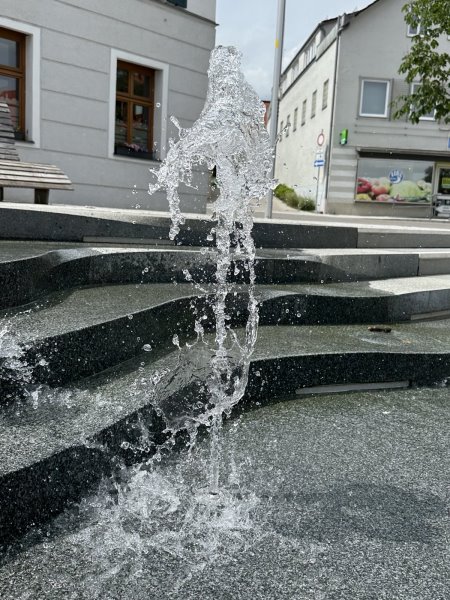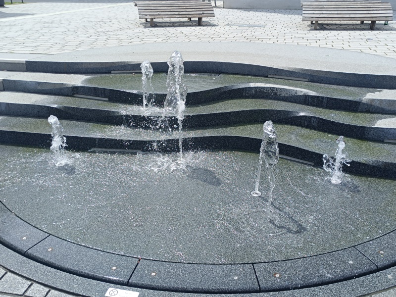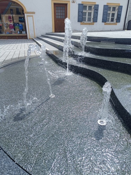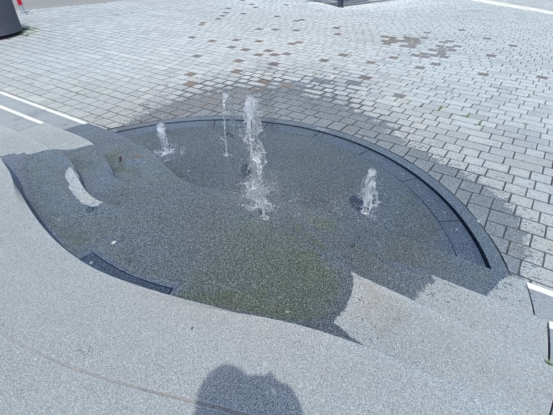 Brunnen mit fünf Bodenfontänen fügt sich sehr schön