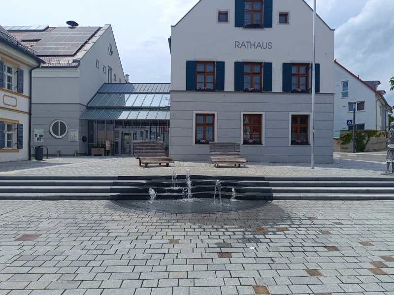 in die Treppenanlage vor dem Rathaus Markt Indersdorf ein. Der Granit